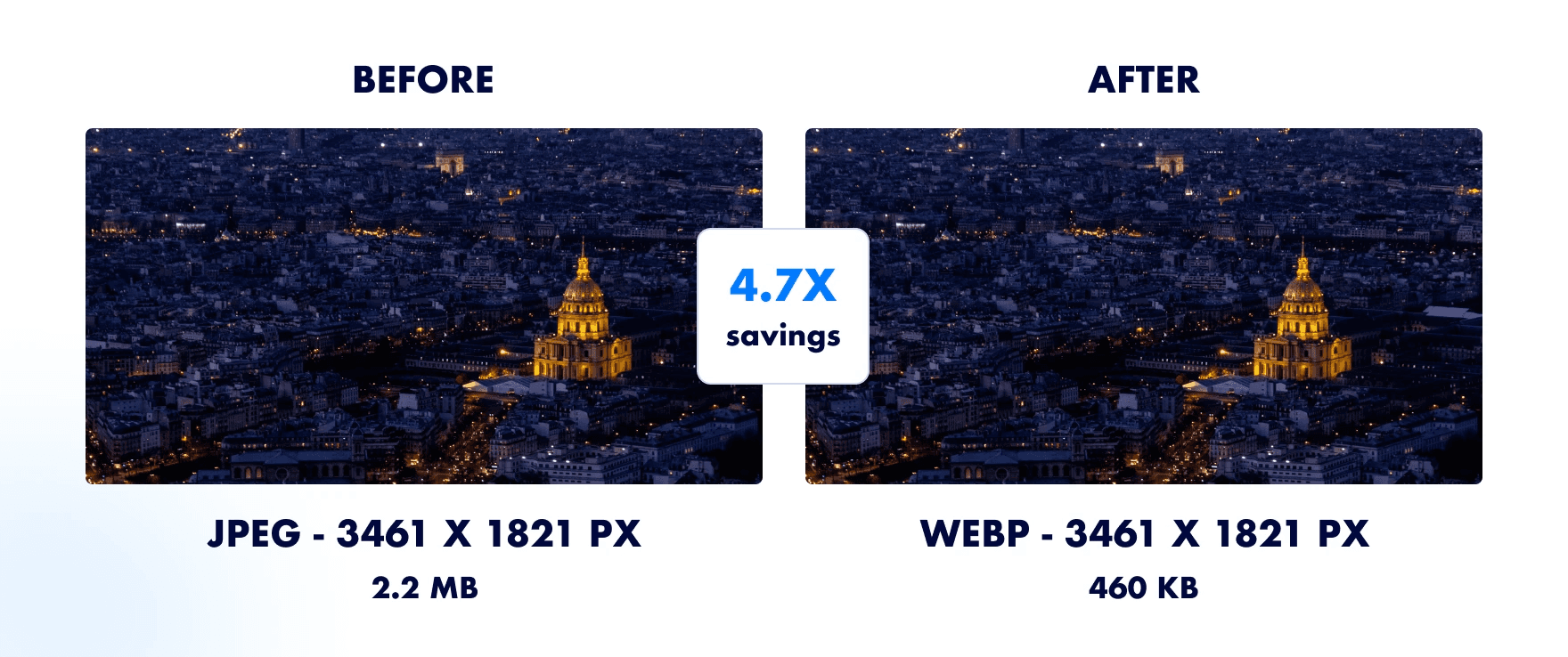 Convert images to modern formats like WebP or AVIF - these are typically 25–34% smaller than JPEGs at the same visual quality.