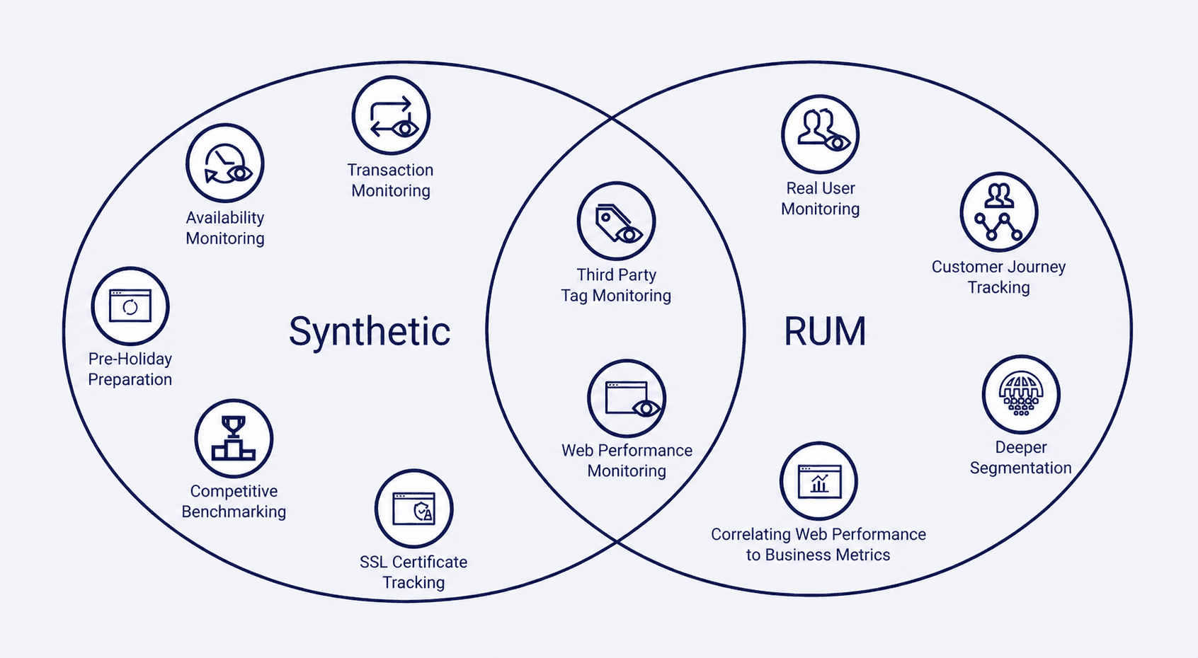 Synthetic monitoring is consistent and great for benchmarking, but it never reflects the variability of users. Real User Monitoring captures the messy reality of the internet, but it can be harder to debug due to noise. In short, they're complementary tools, not competitors.