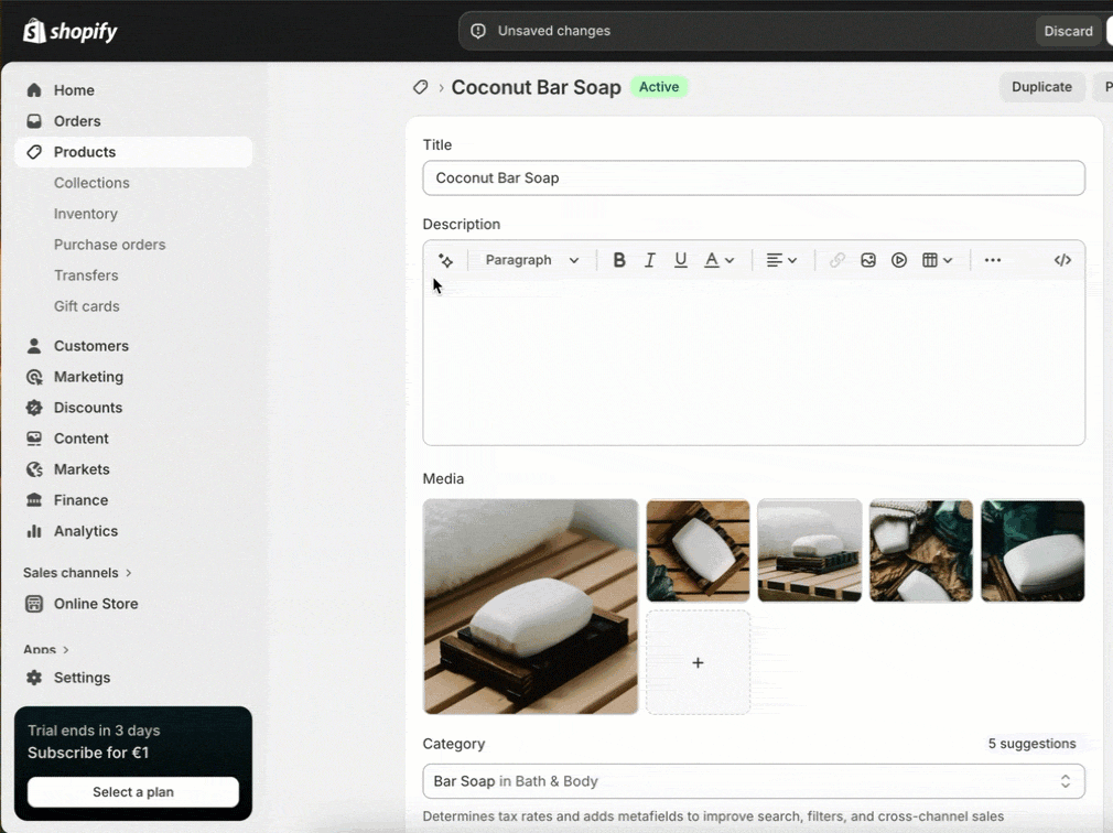 Shopify Magic is active by default. Open any product page, click the Magic icon, and generate a description. Do the same for your email campaigns.